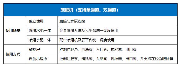由两部分组成:泵注入式施肥装置和施肥控制系统。运用物联网、大数据、云计算与传感器技术相结合的方式,只需在触摸屏上输入肥料等相关参数,系统便能根据所需的施肥量输出计算结果,指导用户进行高精度和高施肥均匀性的水肥一体化作业。也可以直接手动控制注肥泵、搅拌器等硬件设备。